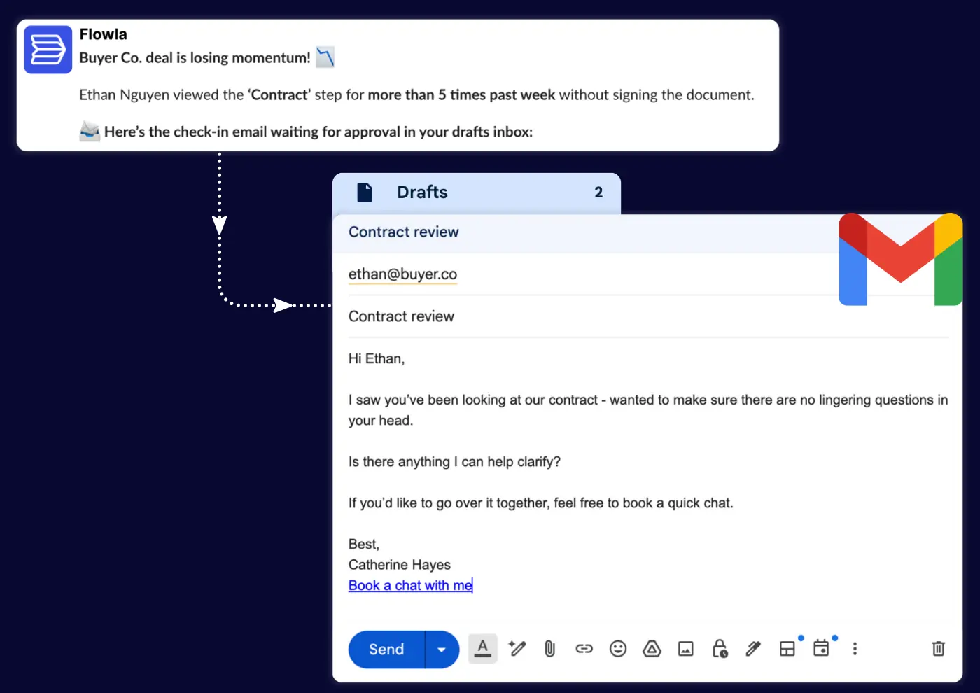 🪄 Client looked at contract but hasn't signed in 7 days? → You get a Slack ping with a check-in message to approve & send right away