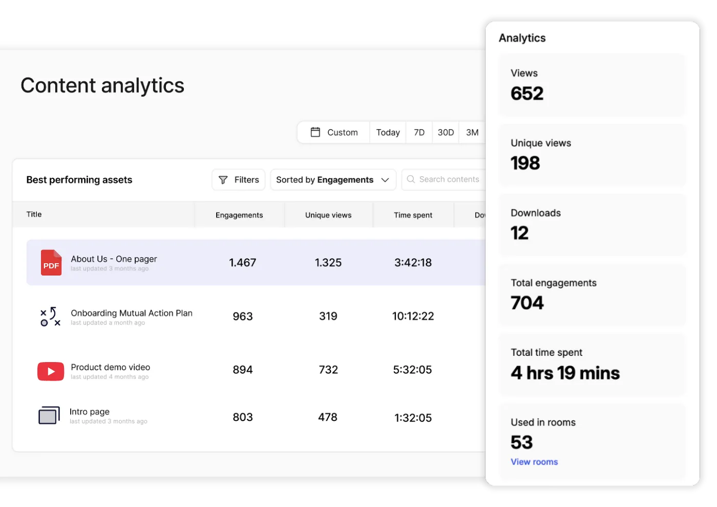 Track asset usage, document performance, and buyer engagement across deal rooms.